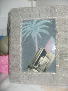 i used some of my grandma's old dresses as a mat for some pictures. her dresses were so worn, you could see through them! i love having pieces of her in the room. there's a picture of her in one frame as a teen, she was a hottie!